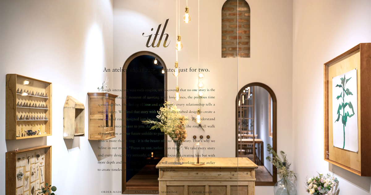 ガラス張りの開放的な空間と吹き抜けの天井が印象的なアトリエで、ゆったりとした雰囲気の中、指輪選びをお楽しみください。