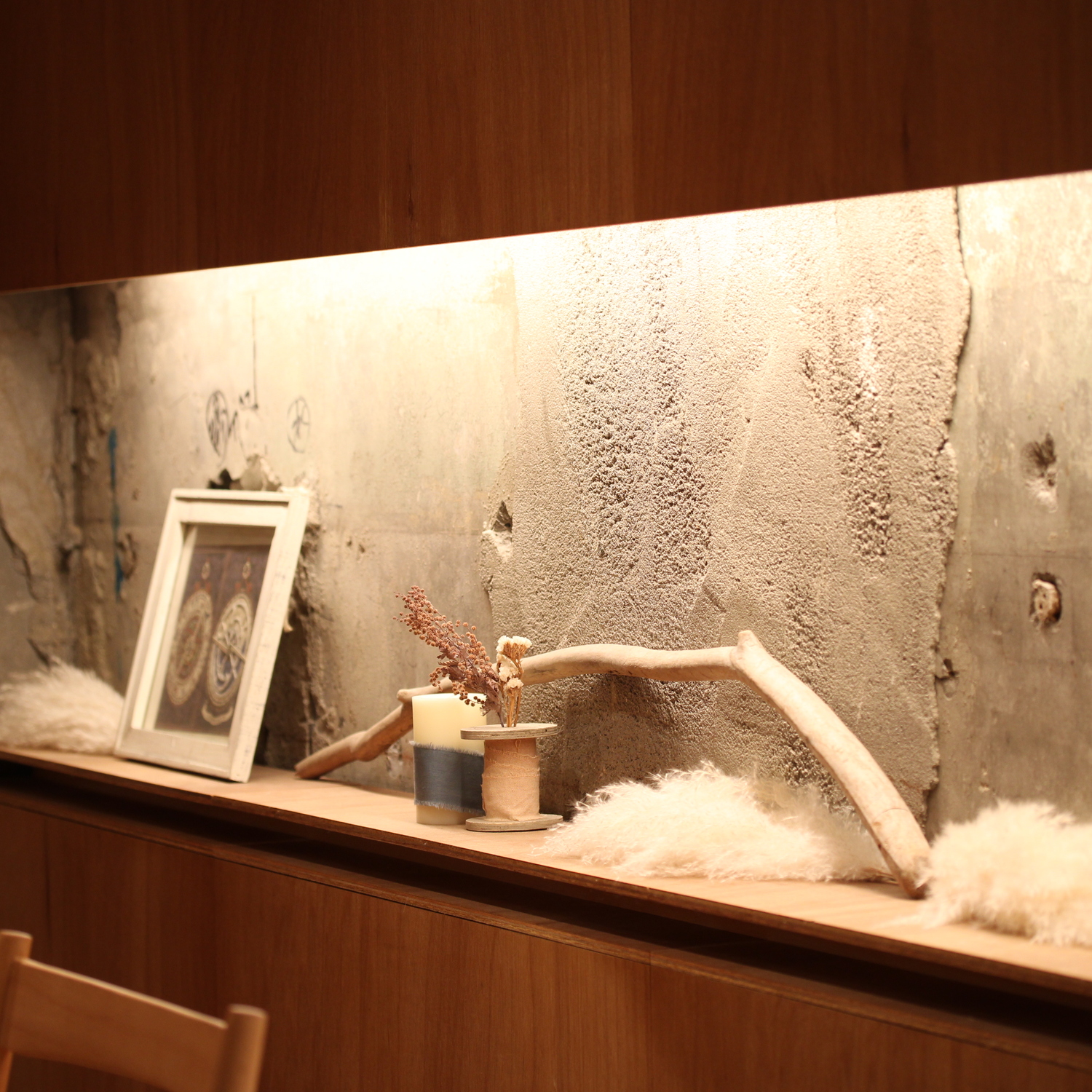壁沿いには流木のような木々が並び、