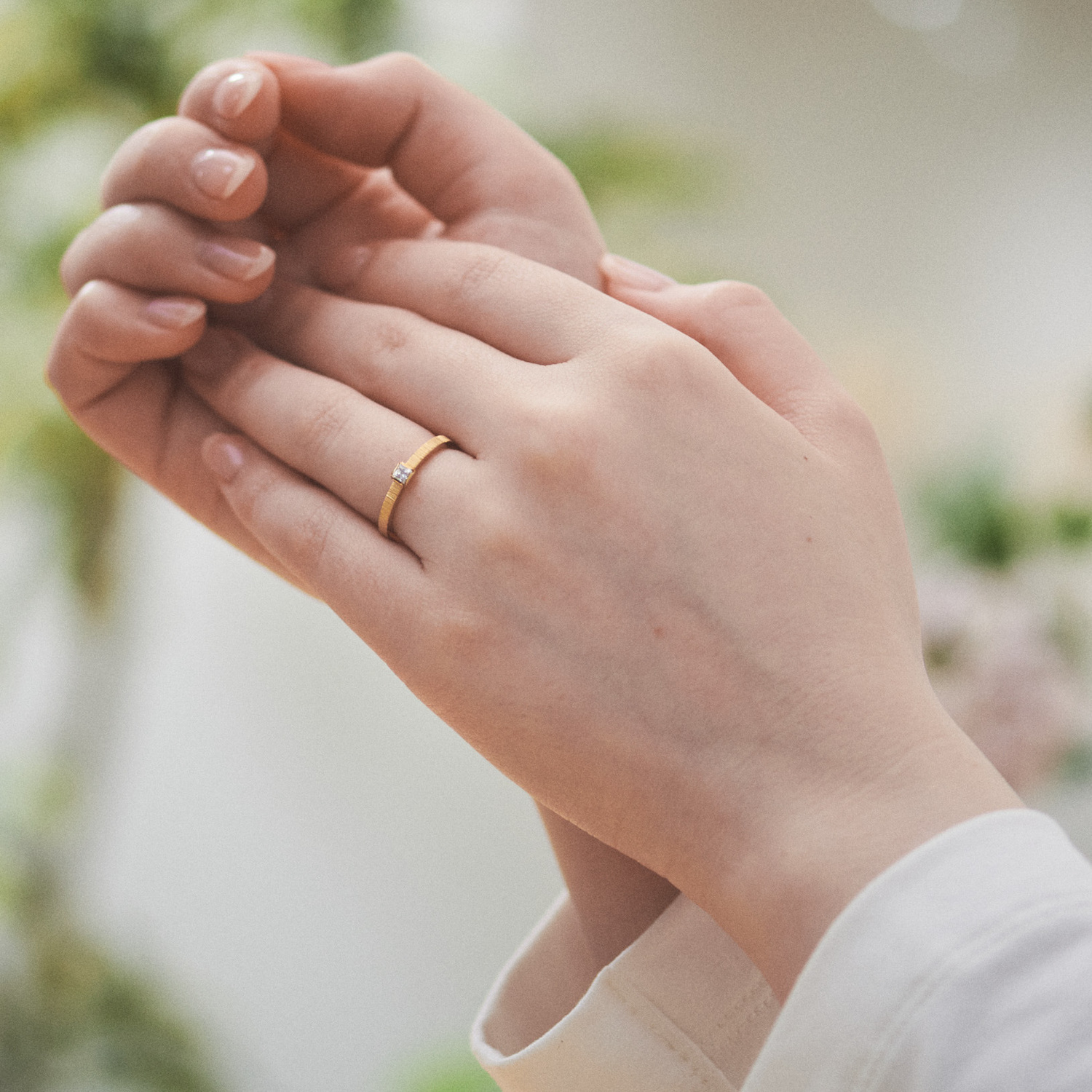 婚約指輪の上品な輝きが、