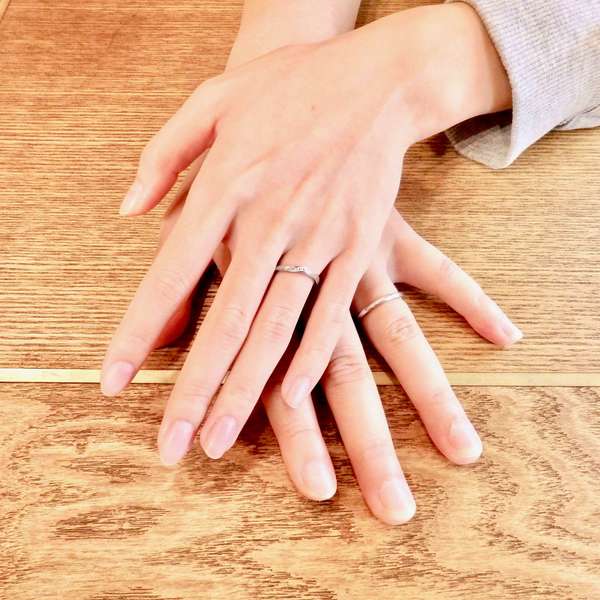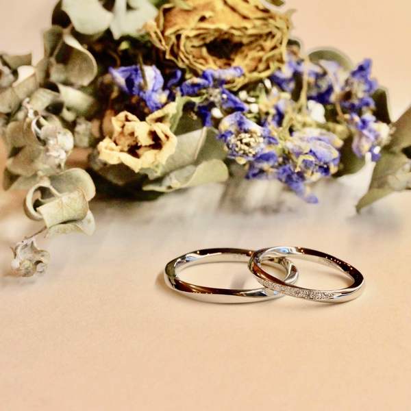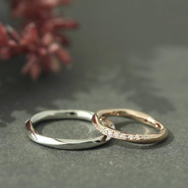 ゆっくりと夫婦の形を見つけてほしい、という意味を込めて、緩やかにツイストされた形が特徴。リングの内側にも、ツイストの形がそのまま現れた躍動的なリングフォルム。真新しさを感じる鏡面仕上げや、さりげなく輝くダイヤモンドに、花嫁の憧れが詰め込まれている。