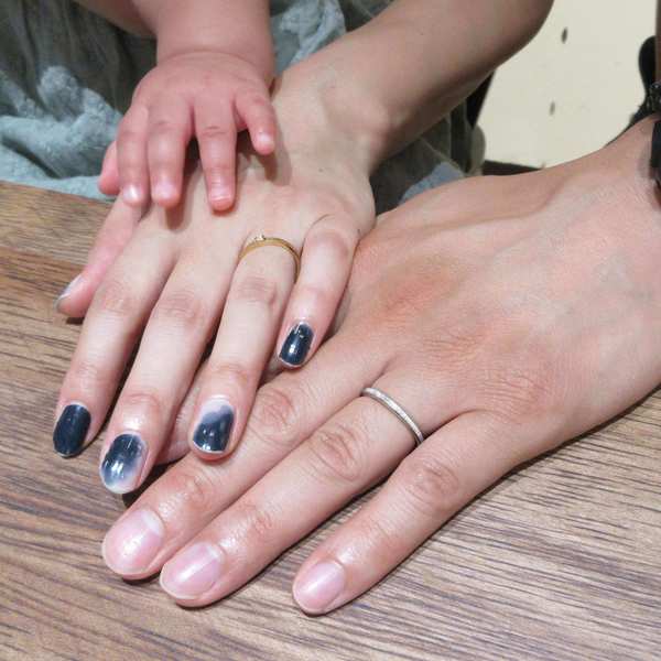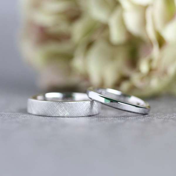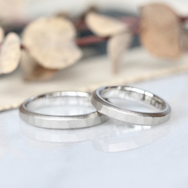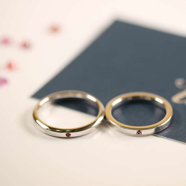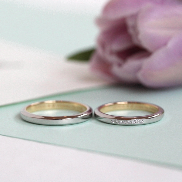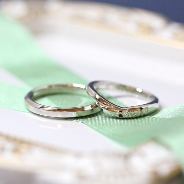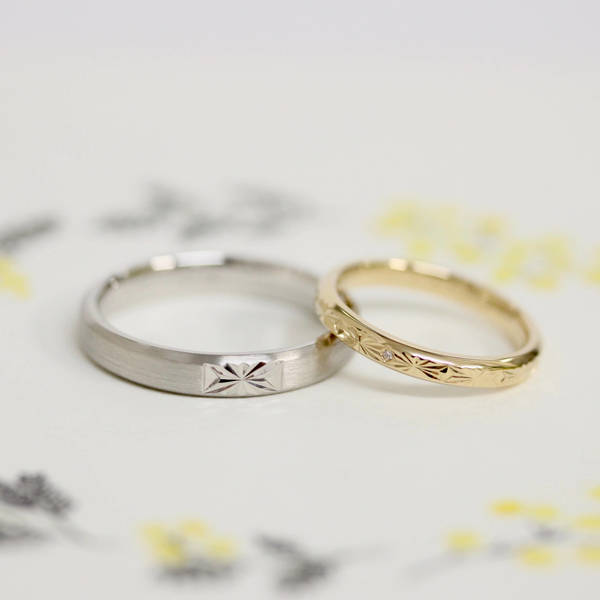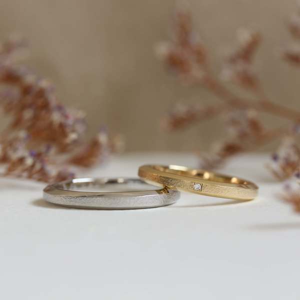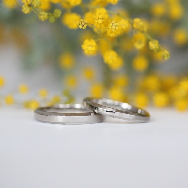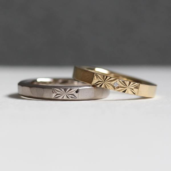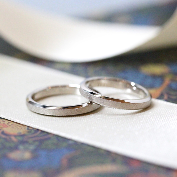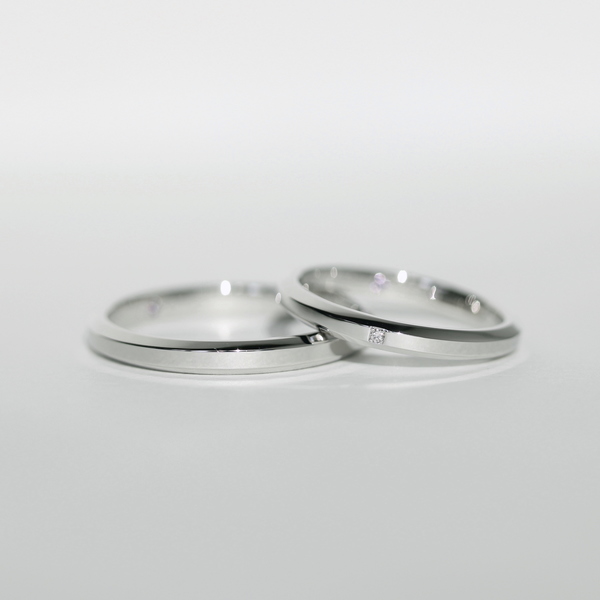 平打ちリングの角を面取りした、鎬(しのぎ)という断面の形状をした結婚指輪。シンプルな中に、さりげなく入る2本のラインが指輪の印象をすっきりと見せるデザインです。中央に入るダイヤモンドはシャープな形状と合わせて、四角く囲ったマス留めという石留めを施しています。