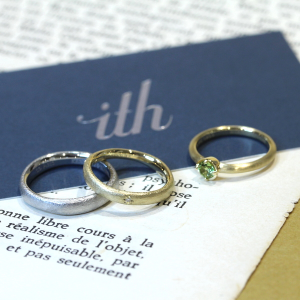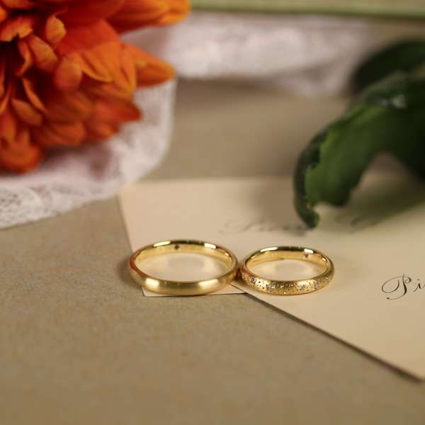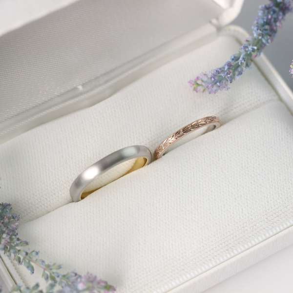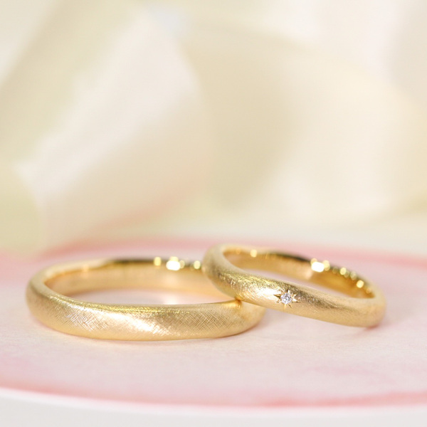 粘土を手でこねたようなシルエットには、手仕事の温もりが宿っています。ラフな形をマットな質感で仕上げ、ダイヤモンドを夜空に浮かぶ星座のようにランダムに留めることで、カジュアルに身に着けられる結婚指輪です。