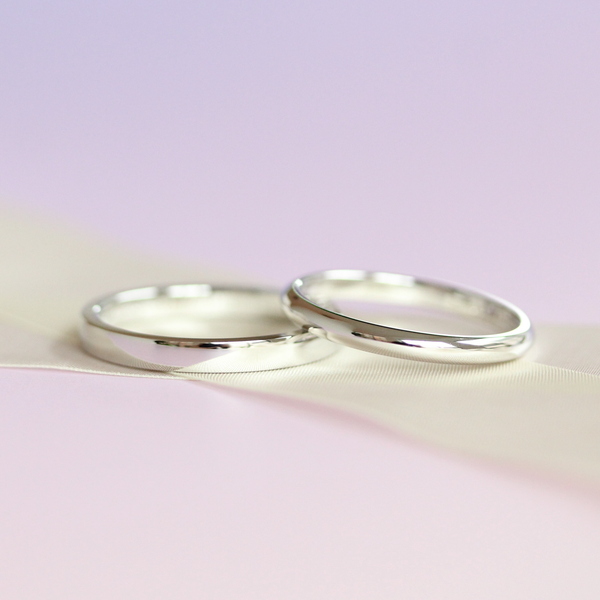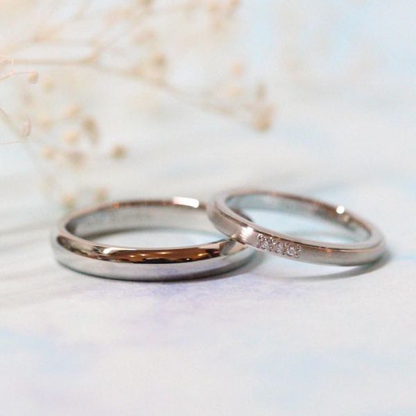 強度にこだわった鍛造製法だからこそ、揺らぎのない整った印象があります。丸みを抑えた平甲丸の形状は手元をすっきりと見せ、指当たりがなめらかなため、着け心地のよさと程よい存在感が感じられます。女性の指輪はシンプルな中に大きめのダイヤモンドが存在感を放つデザインです。