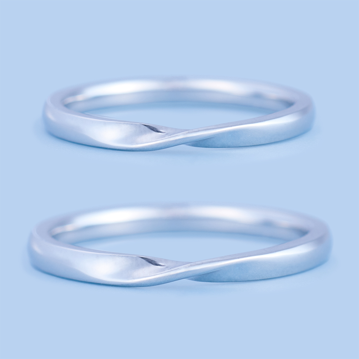 指輪の形状がメビウスの輪と同じように、表の面が内側に、また表へと繋がっています。職人の手の感覚から生まれる立体的なツイストは中央が細くなるようくびれがあり、指を細く見せてくれます。ひねりの部分の丸みが強く、優しい印象のデザインです。