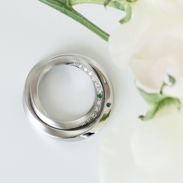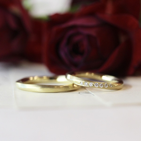 ゆるやかに全周ツイストしている形状がわかりやすいように、マット加工を加えたアンティークな雰囲気のデザイン。ツイストした形状に合わせて美しく留められたダイヤモンドと、落ち着いたマット加工のコントラストが指元をきれいに見せてくれます。