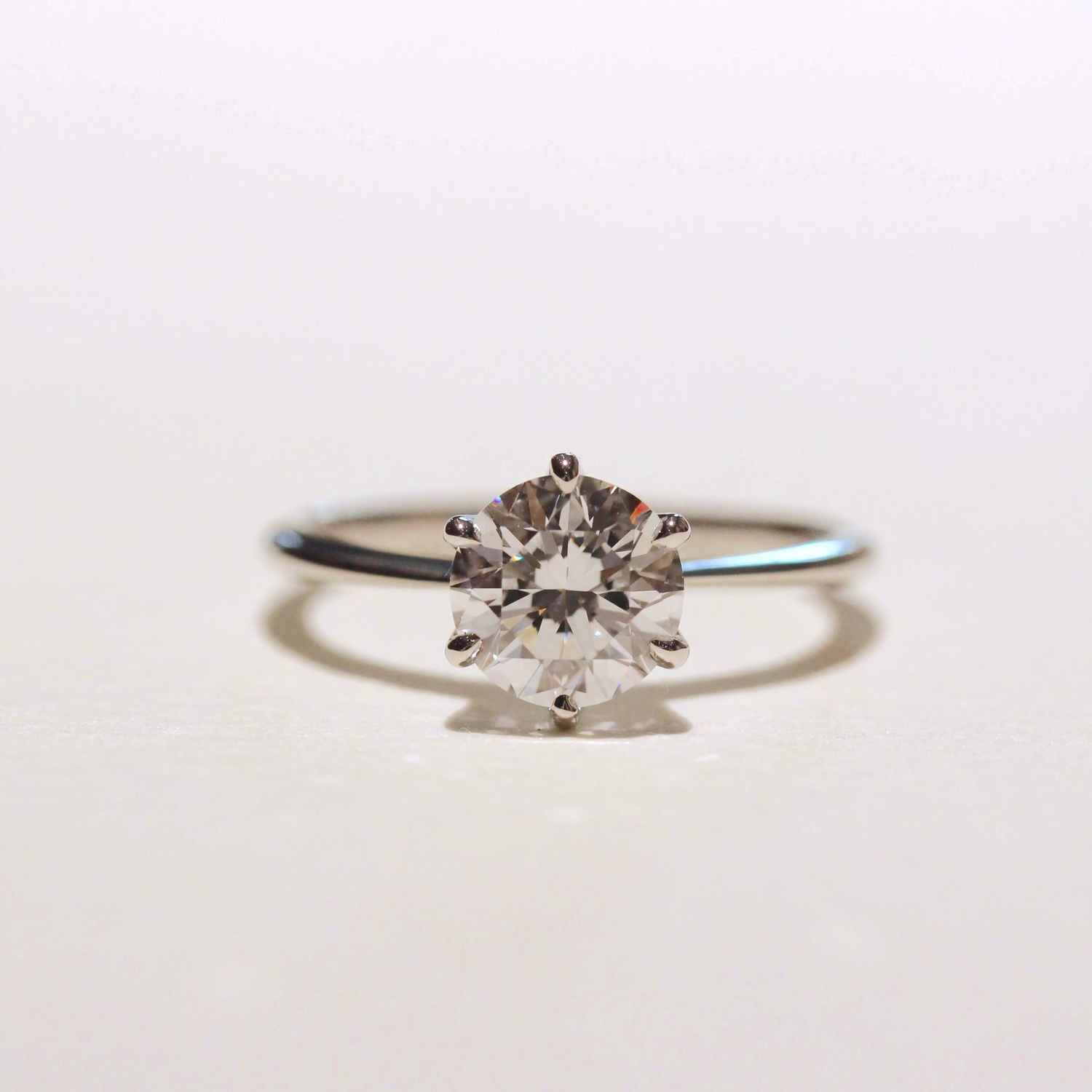 華奢なリングアームと、ダイヤモンドを留める6本爪が、主役である石の輝きを引き立てるデザイン。