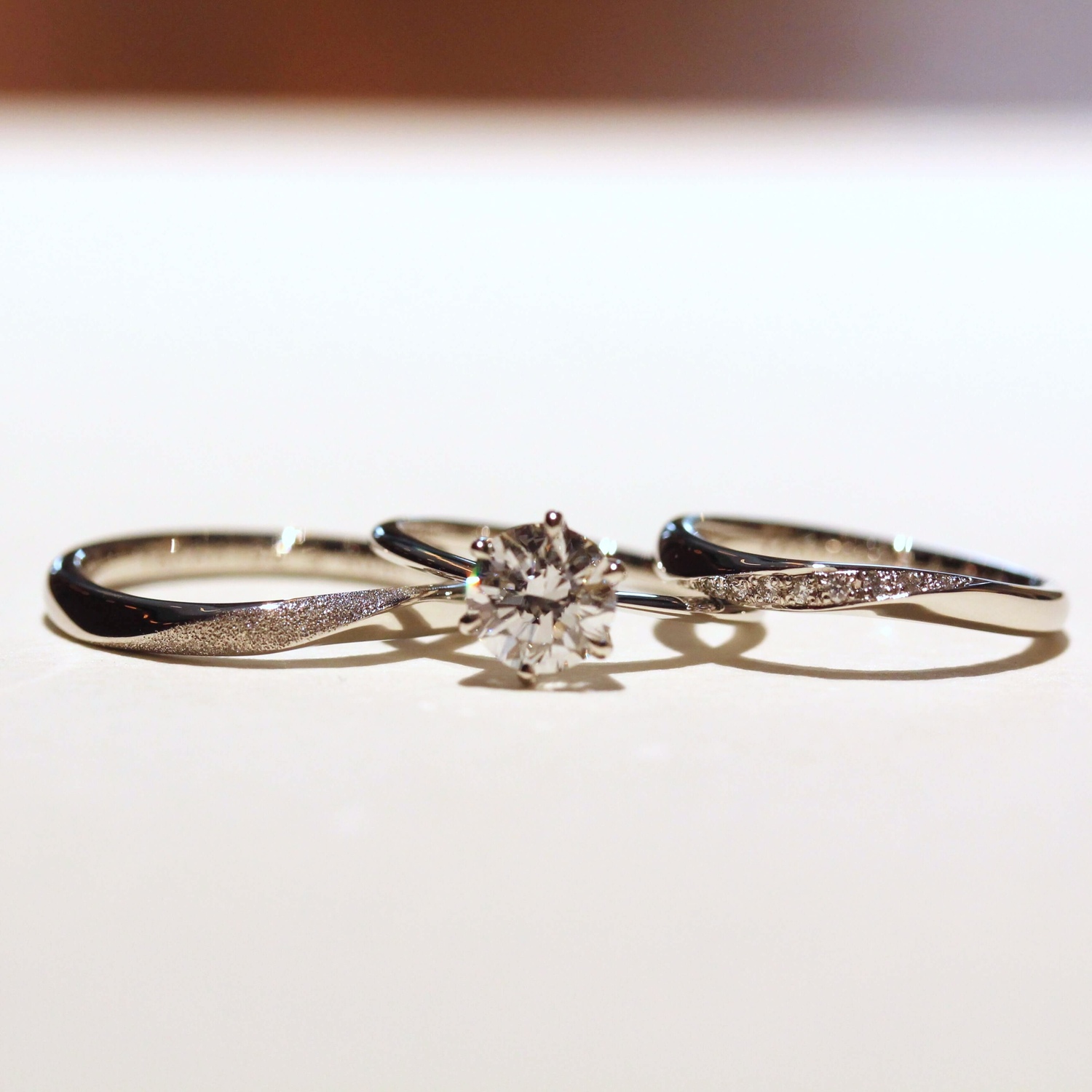 婚約指輪のセンターダイヤモンドを、結婚指輪のカーブが受け止めるように重なる様子も、美しい調和を生み出しています。