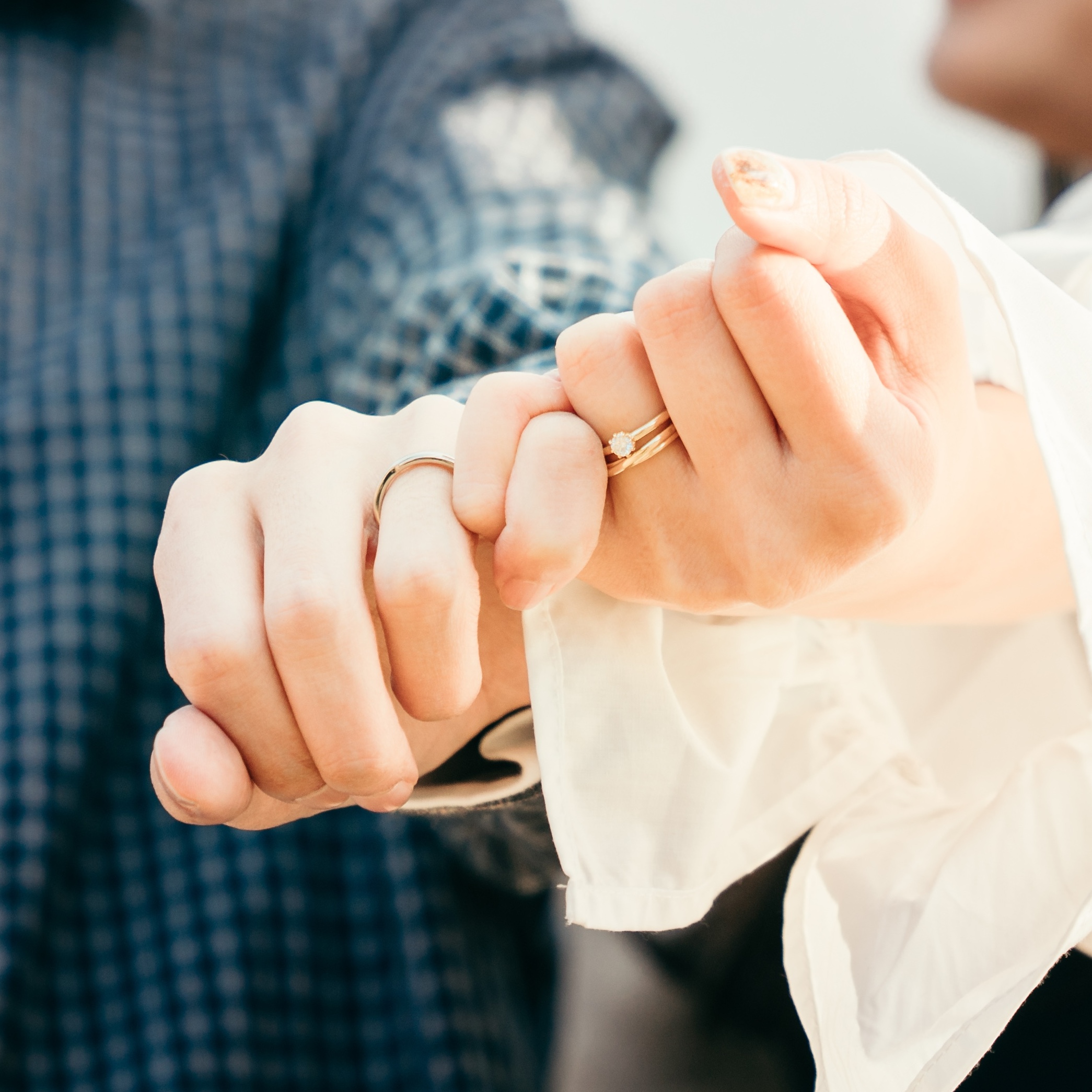 ・一目惚れしたダイヤモンドでお作りした婚約指輪とお二人の手に寄り添う結婚指輪